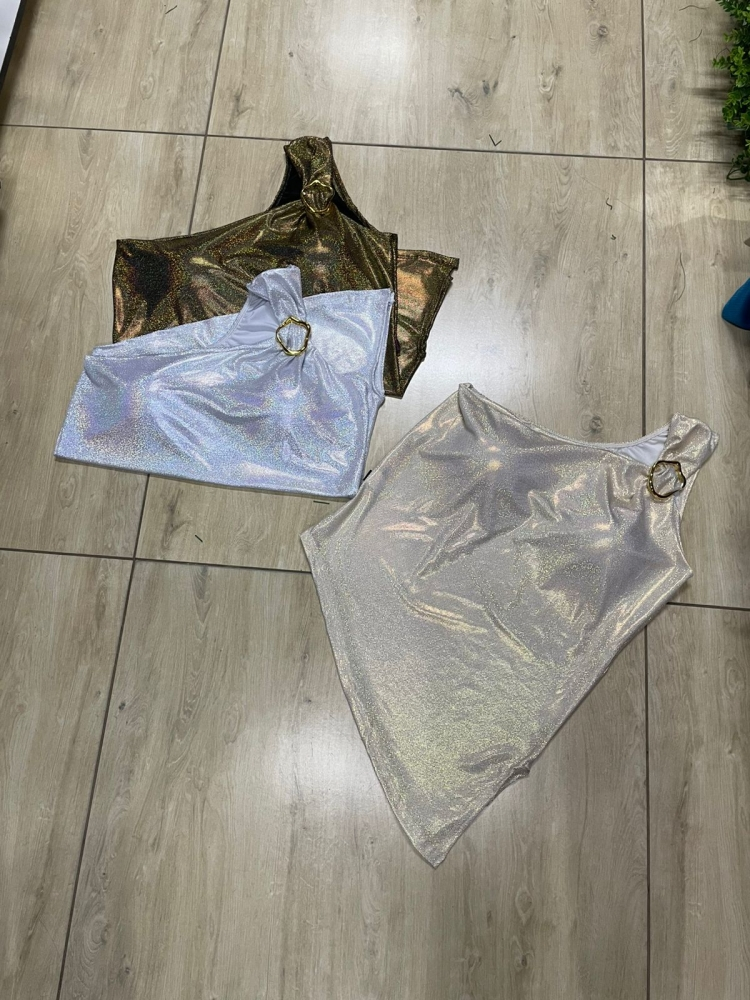 Blusa Laminada Nula Manga Com Fivela Assimetrica Plus Size Vestindo do 46-52